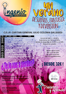 Os recordamos que aún podéis inscribiros en la Escuela de Verano que se organizará en nuestro colegio por la empresa Ingenio Educativo, que se oferta del 23 al 30 de junio, del 1 al 31 de Julio y del 1 al 8 de septiembre, con posibilidad de servicio de acogida de 7:30h a 9:00h y servicio de despedida de 14:00h a 15:30h, con servicio de comedor o canasto opcionales.